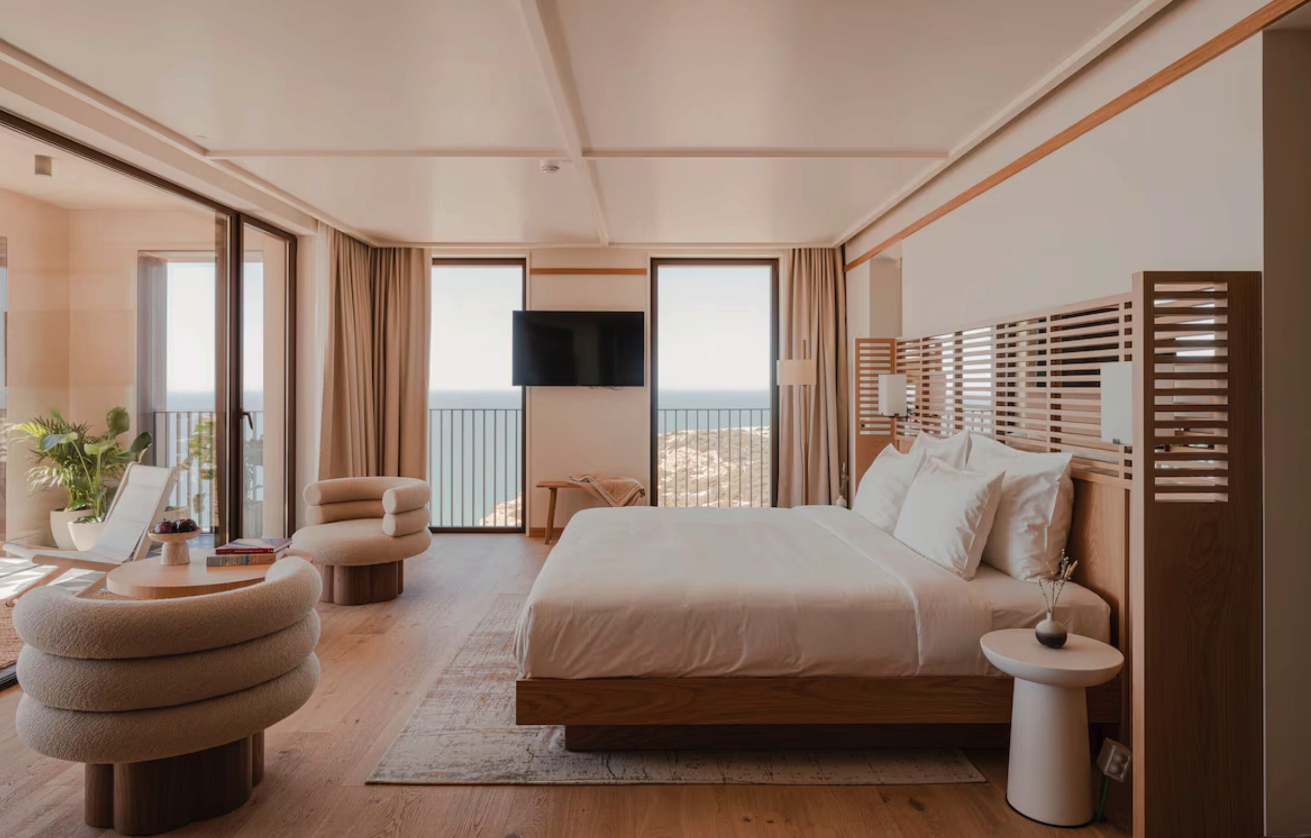 Aethos Ericeira is set on the cliffs just outside Ericeira, with wide Atlantic views and a strong connection to the ocean. The setting feels open and calm, with the sound of waves and lots of natural light shaping the mood throughout the hotel. While it’s close to town, the atmosphere here is more retreat-like, designed for slowing down rather than ticking off sights. The hotel has a relaxed but upscale vibe. Life at Aethos revolves around the outdoors. Mornings often start with a swim, surf session, or yoga, followed by long breakfasts and relaxed afternoons by the pool. The hotel attracts surfers, couples, and travellers who like an active rhythm balanced with comfort and good food. Evenings are easy and social, with sunset views, simple but well-executed dining, and a sense that there’s nowhere else you really need to be.