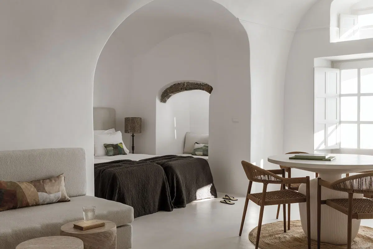 Blending traditional Cycladic architecture with modern minimal design, this spacious suite includes a king-size bed and additional single or sofa beds. A private terrace with an outdoor hot tub overlooks the caldera and volcano.