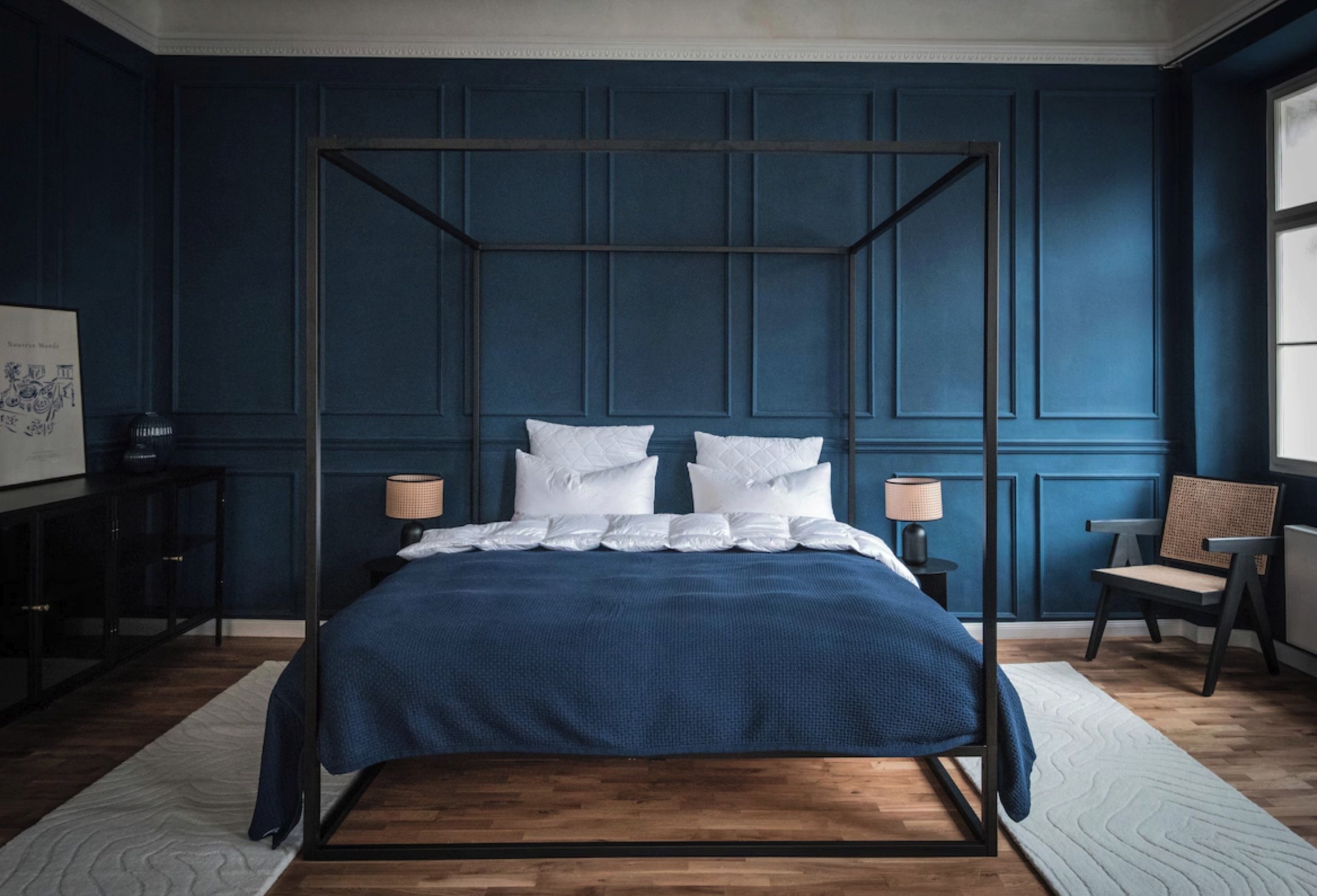 A spacious, stylish bedroom-living suite with deep blue panelled walls, a modern canopy bed, and elegant minimalist décor.