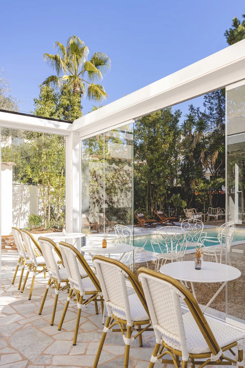 Hôtel Le Sud is set in the heart of Juan-les-Pins on Rue Marcel Paul, a short walk from both the beach and the train station. It has a central location, but the garden and pool at the back give it a softer, more tucked-away feel once you are inside. The hotel has 29 rooms, and the atmosphere is more small-scale and relaxed than a typical Riviera seafront address. The style is bright and playful, with a terrace, garden and outdoor pool that make it feel especially good for an easy summer stay close to the beach.