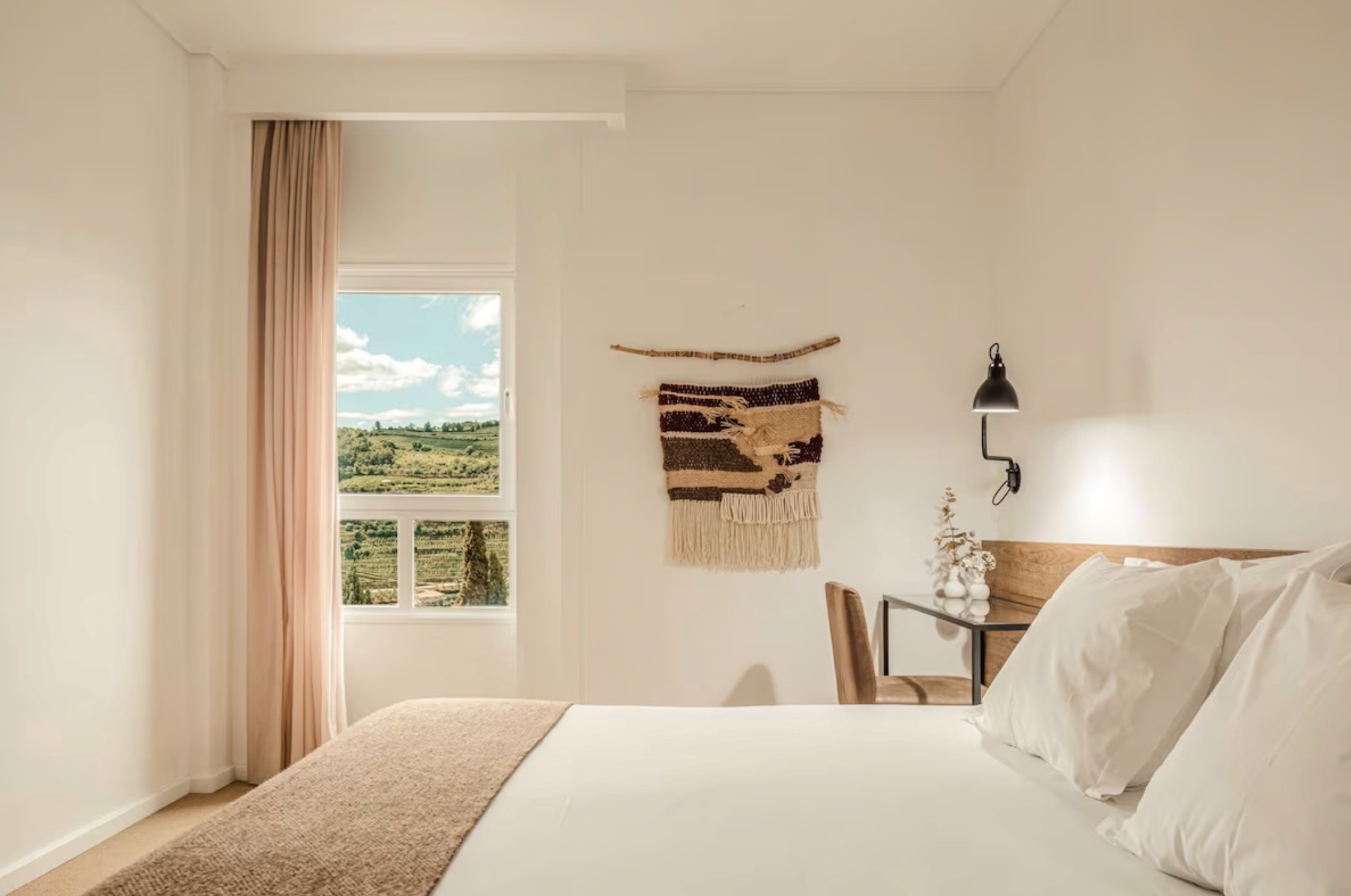Rooms furnished with natural tones and Portuguese design details like tapestries and blankets from local makers.