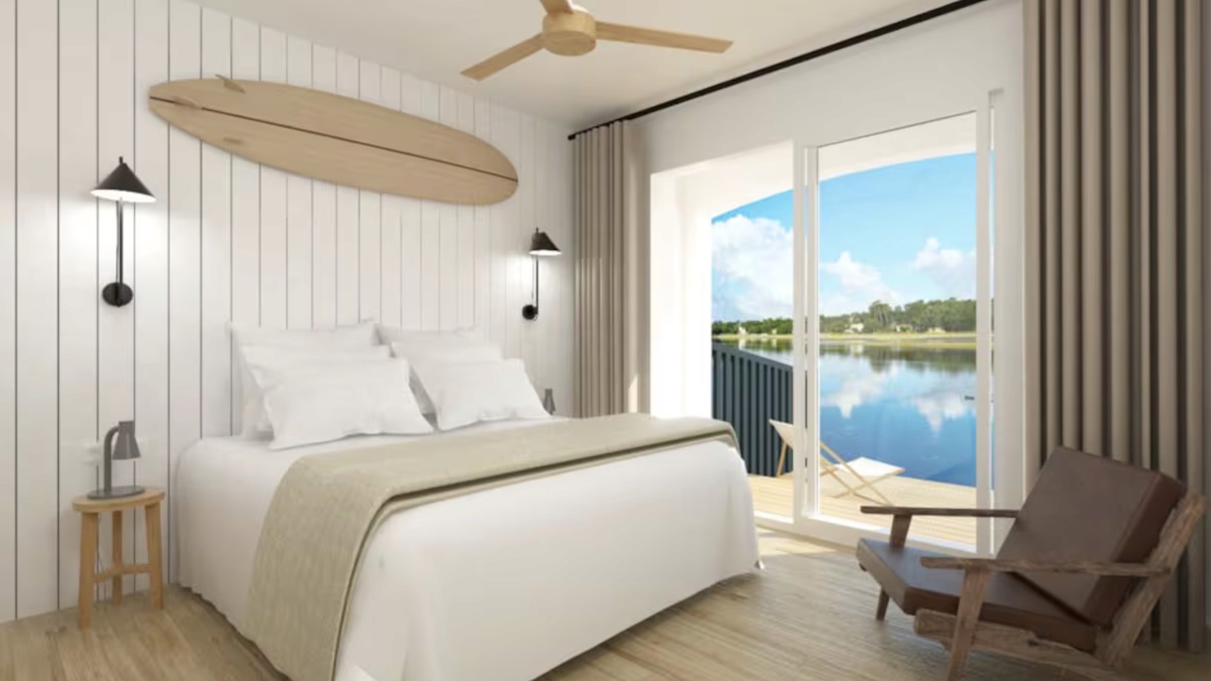 A lakefront position with direct access to Hossegor’s marine lake, which gives the hotel a much calmer atmosphere than a straight beach address and makes paddleboarding, lakeside walks, and quiet mornings part of the stay
