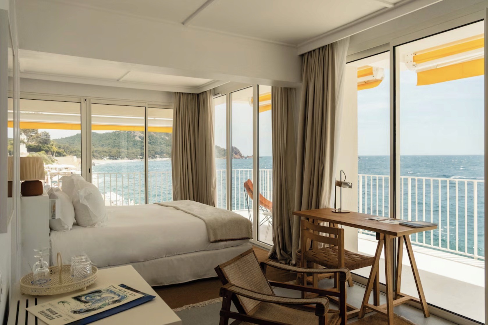 Les Roches Rouges is a seafront hotel set right on the rocks in Le Dramont, just outside Saint-Raphaël on the Côte d’Azur. The whole place is built around the view, with terraces and big windows facing the Mediterranean, and that warm red coastline of the Estérel right behind you. It feels bright, calm, and very “Riviera”, with a style that’s clean and timeless rather than showy. Days here revolve around the water. There are two pools: a heated outdoor pool for long swims and a seawater pool carved into the rocks, sitting right on the edge of the sea. Wellness is part of the rhythm too, with a gym, treatments you can book, and sessions like yoga and Pilates. Add excellent food on-site and direct access to coastal paths, and it’s the kind of hotel where you can happily stay put for a few days without needing a plan.