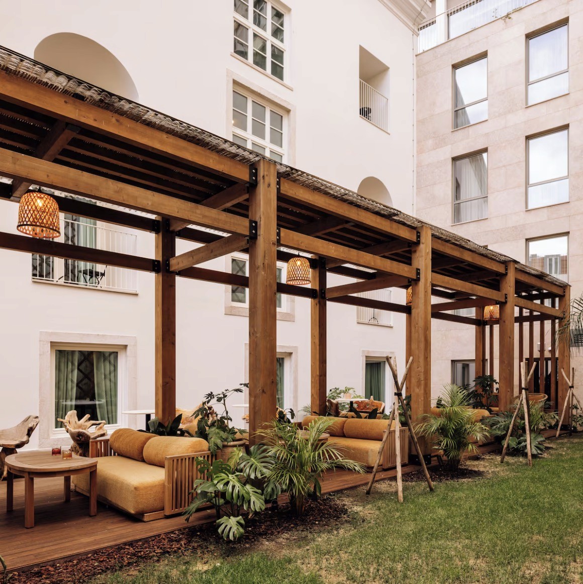 A courtyard outdoor pool on site (a big deal in central Lisbon), with space to actually lounge rather than just dip
