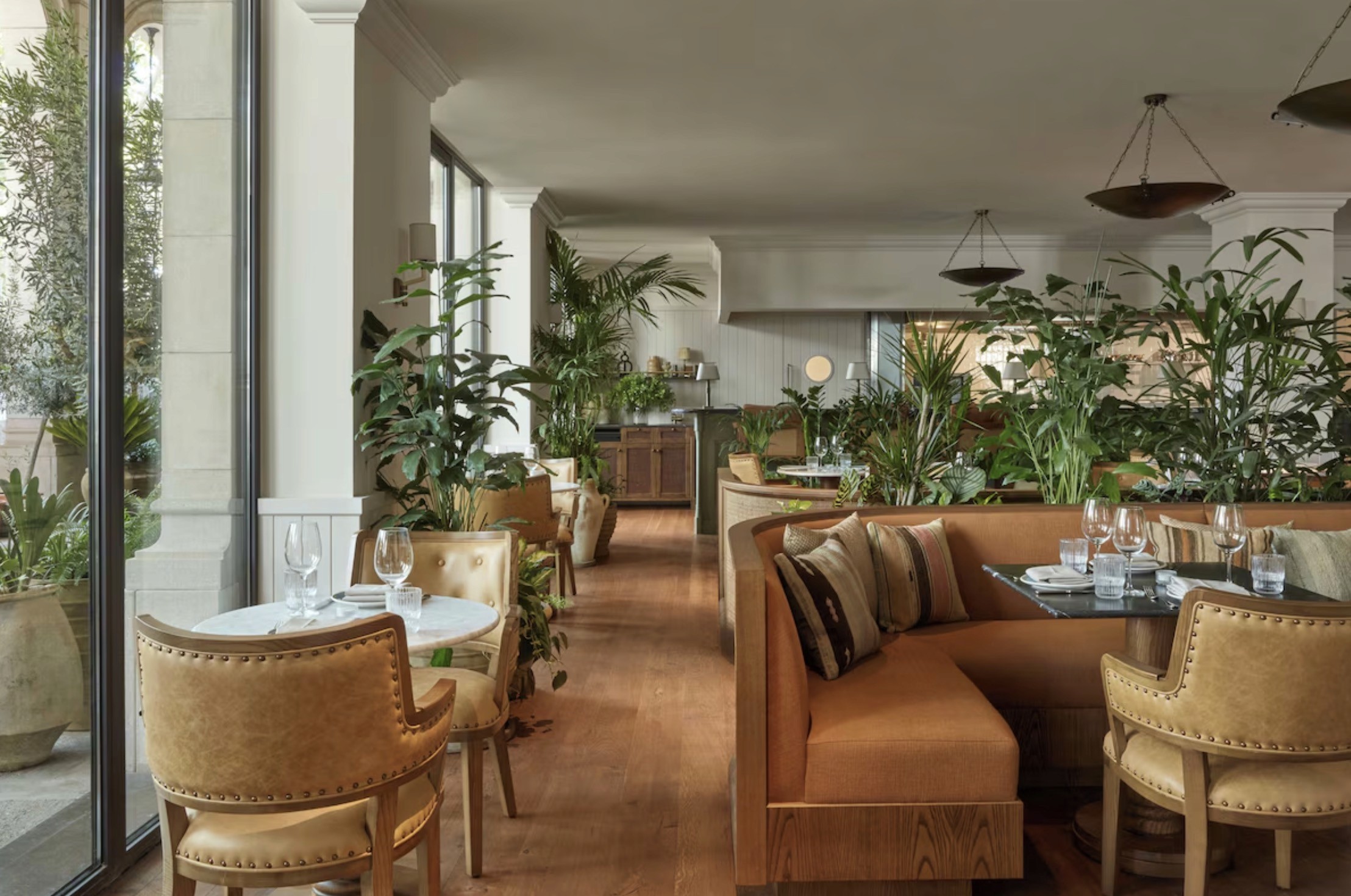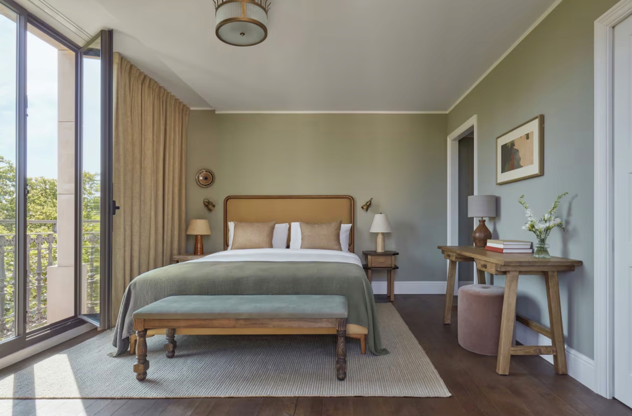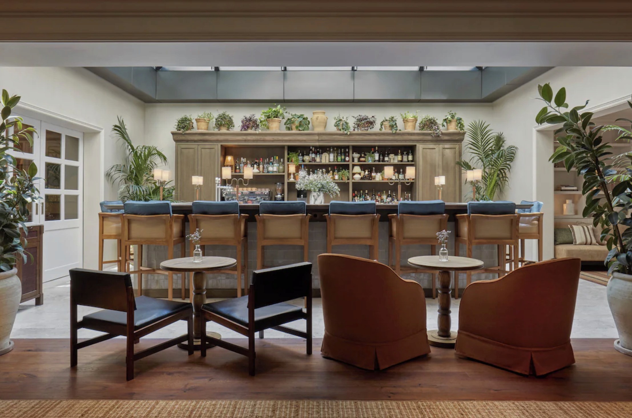 Interiors by London studio Thurstan with warm, earthy tones, Spanish antiques, and local artwork throughout the hotel