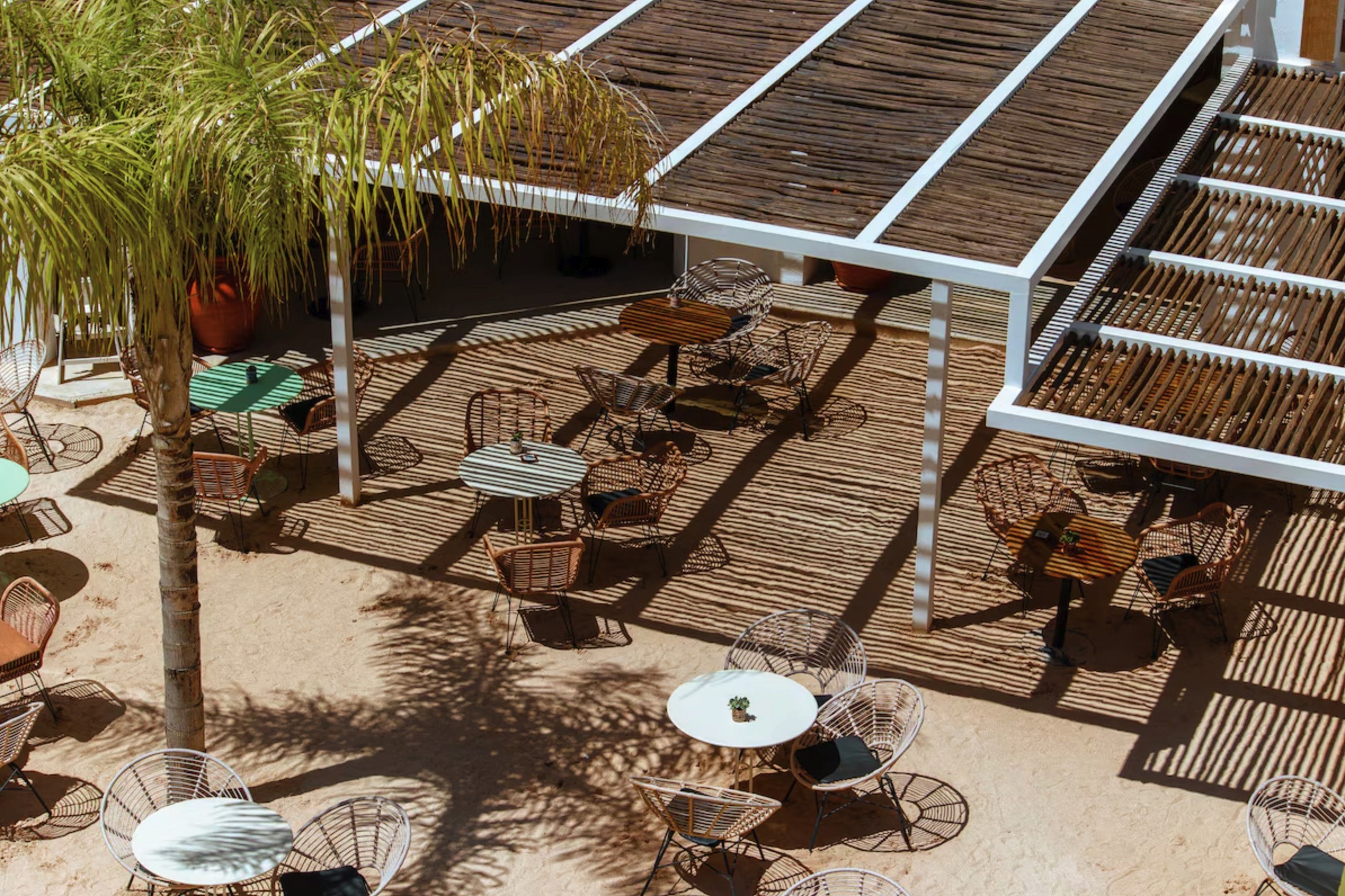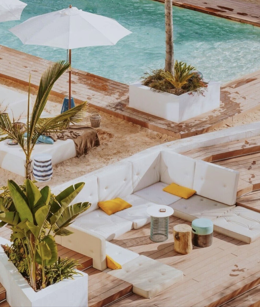 A proper central pool courtyard that becomes the heart of the hotel during the day, with loungers, shade, and a slow, social energy