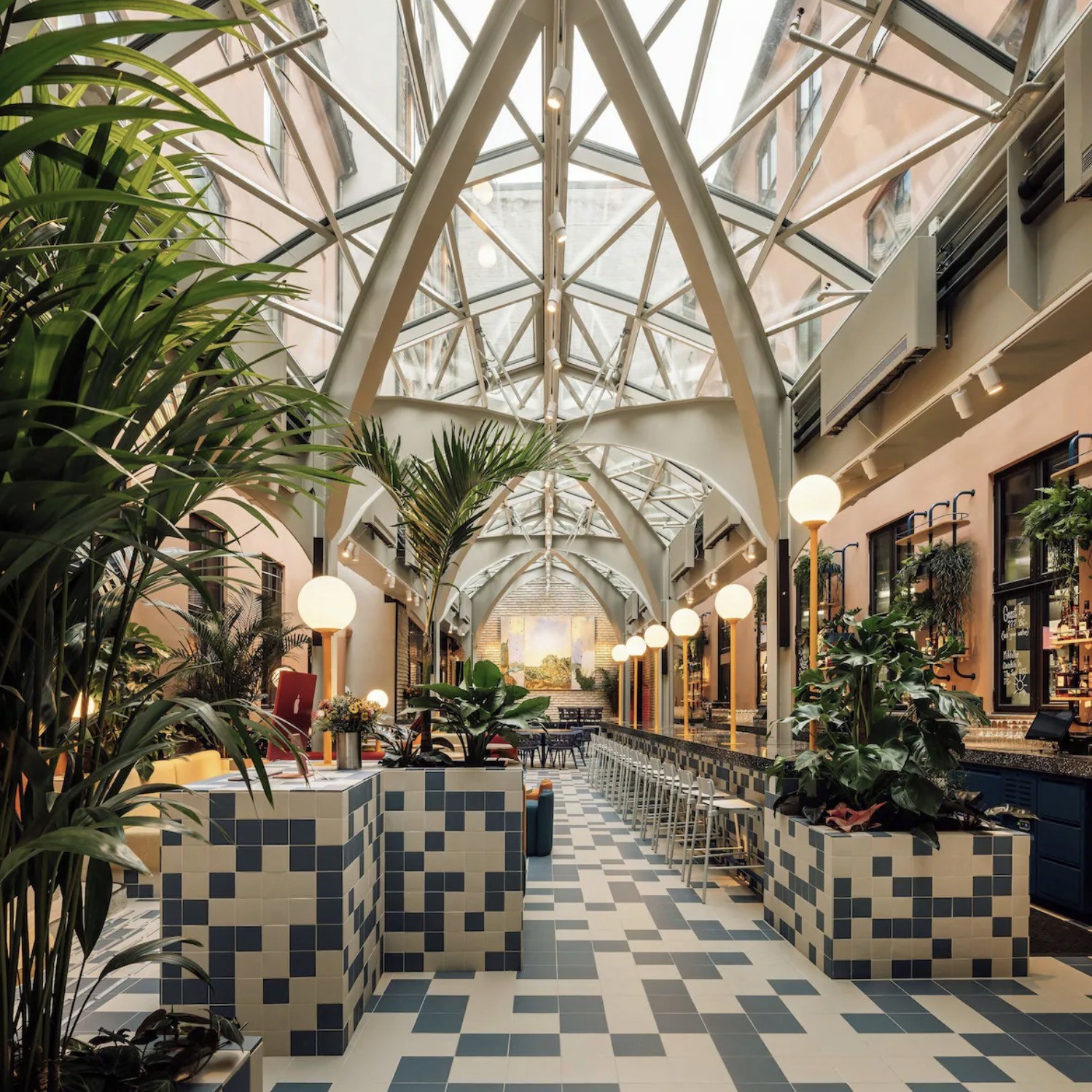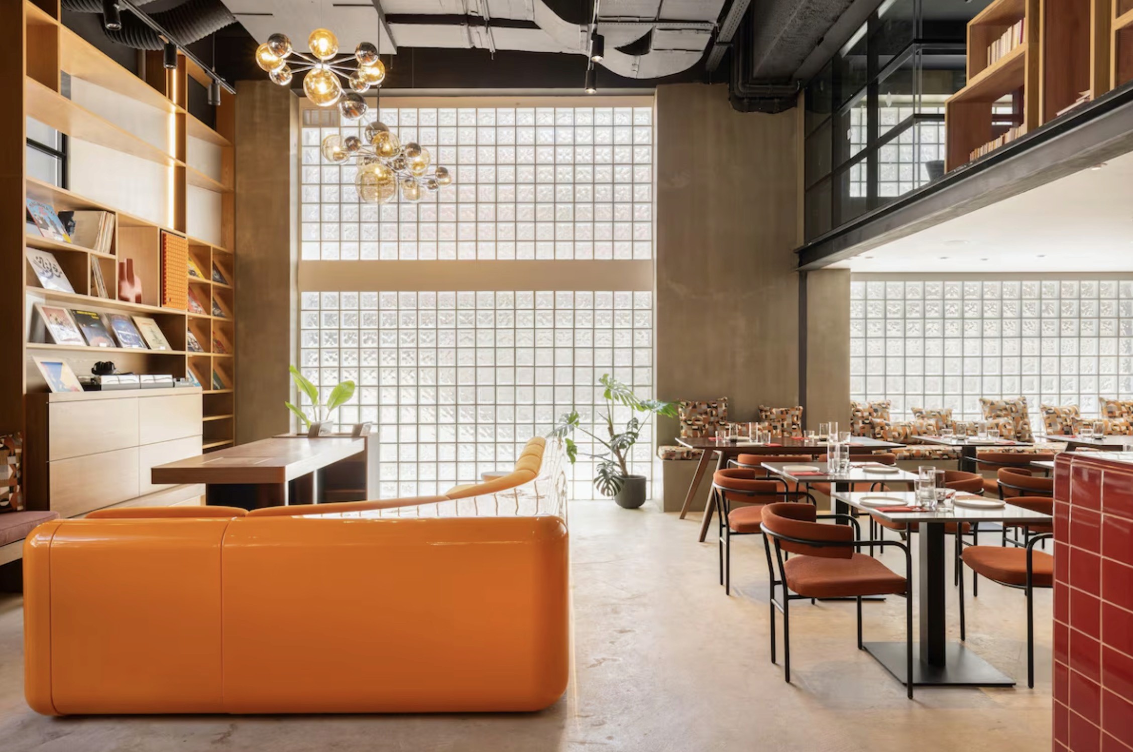 A layout built around more than just sleeping, with a library, restaurant, shared spaces, and work areas that keep the building in use from morning to evening
