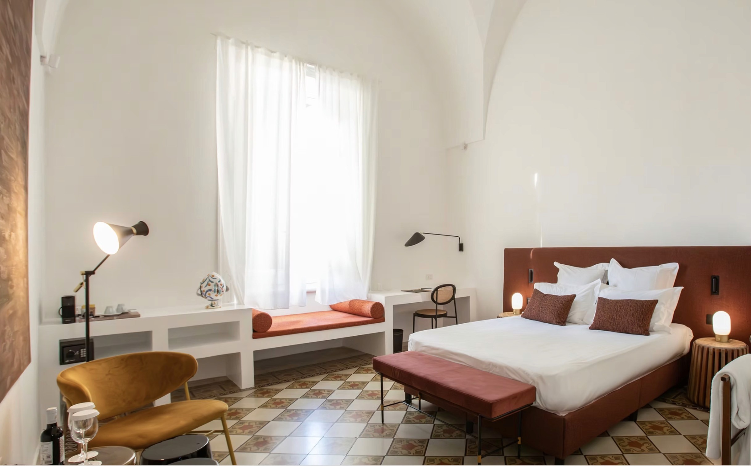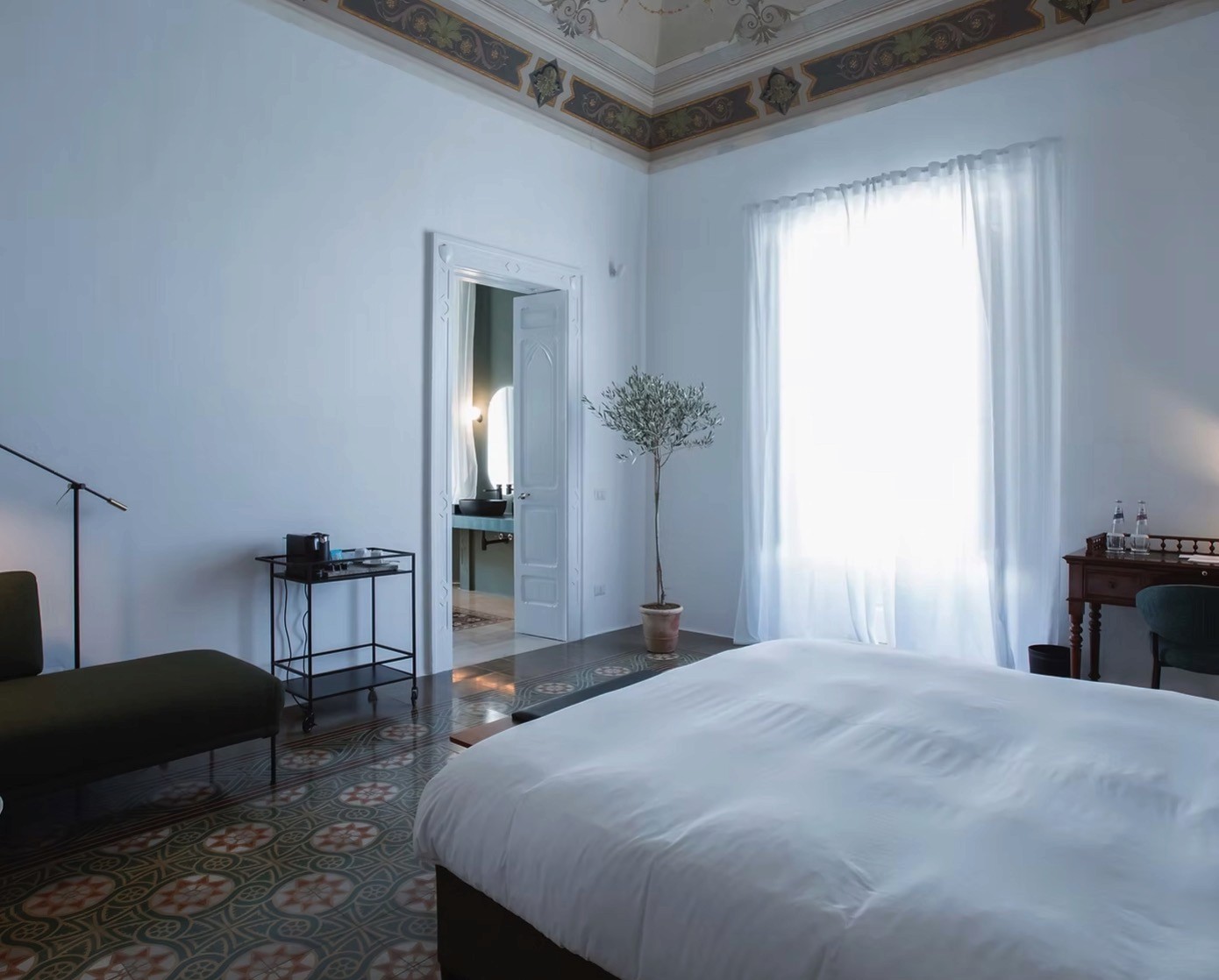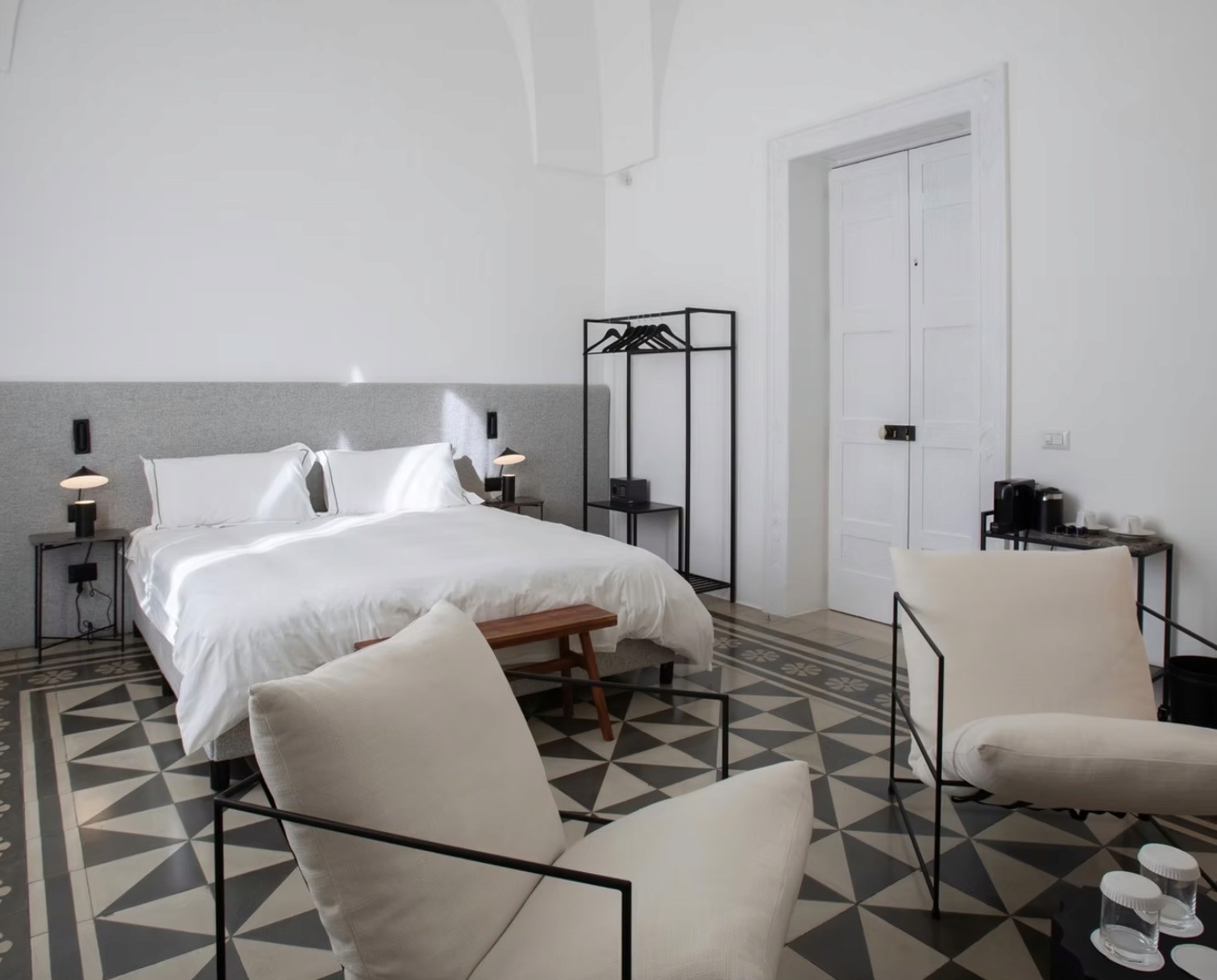 Perched in the heart of Salento, Palazzo Piccinno is an intimate boutique guesthouse housed in a restored early 20th-century palazzo. With just four suites, each space blends historic architecture, with contemporary design, creating a refined but warm atmosphere. The property features a central courtyard, a garden, and a pool that feels tucked into its own peaceful corner, so guests can relax just steps from their rooms. Guests wake to a house-made breakfast and can then drift off to explore Puglia’s lush countryside, nearby olive groves and hidden historic villages. Beaches on both the Adriatic and Ionian coasts lie within easy driving distance, making it a quiet base to discover coastline, culture and slow-living rhythms.