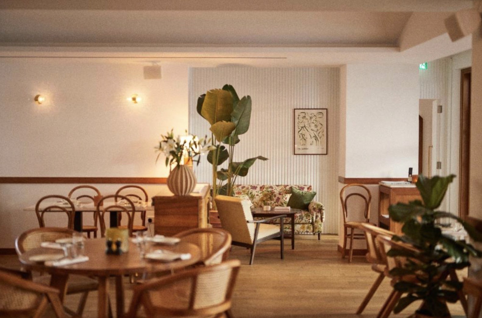 A strong design identity throughout: warm plaster tones, curved details, natural wood, and a carefully lit, calm atmosphere that feels intentionally intimate
