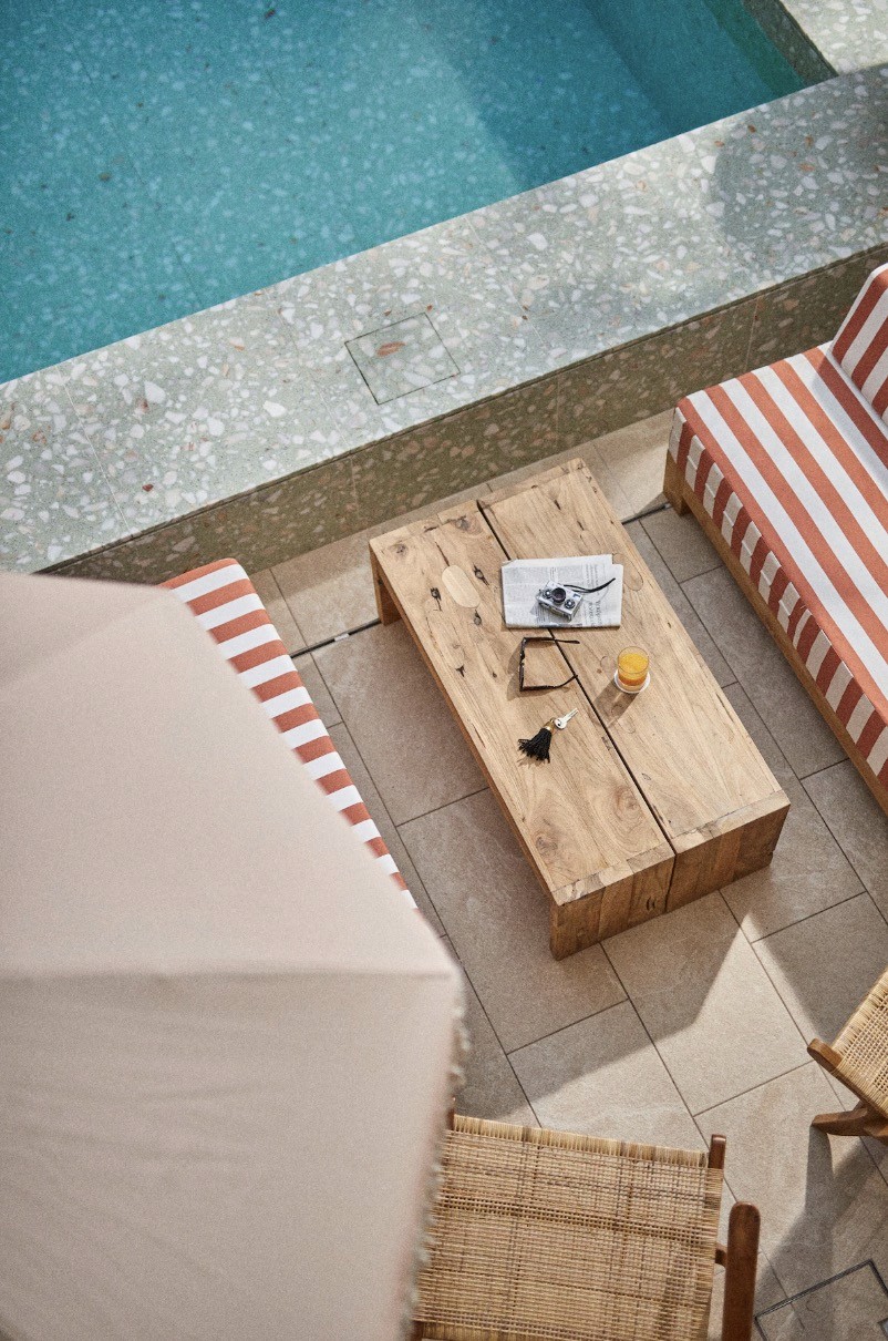 A heated saltwater courtyard pool that becomes the centre of the hotel, perfect for slow afternoons between village wandering and sunset drinks