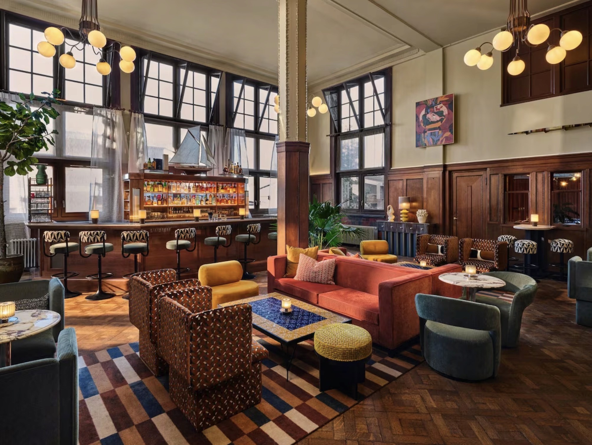 The Hoxton, Lloyd Amsterdam sits in the Eastern Docklands, a quieter waterfront part of the city that feels a little removed from the busiest canal areas while still staying well connected to the centre. It occupies a landmark historic building with deep maritime roots, which gives the hotel far more character than a standard city stay. With 136 bedrooms, the hotel is much larger than a small boutique property, but it still leans into The Hoxton’s more social, design-led style. The atmosphere is lively rather than hushed, with a brasserie, a bar, generous shared spaces and a location that works well if you want Amsterdam with a slightly calmer, more local feel.
