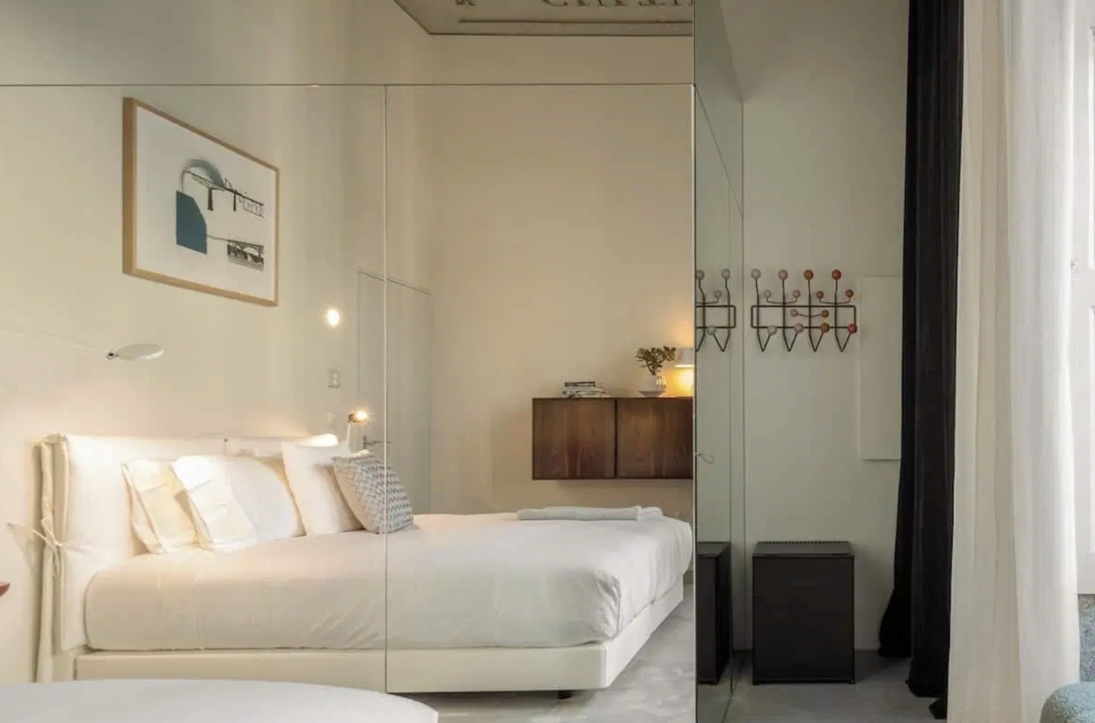 A serene, design-led bedroom features soft lighting, mirrored accents, and a warm minimalist aesthetic for a calm, refined stay.